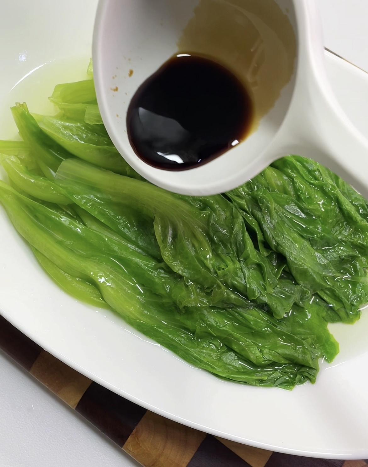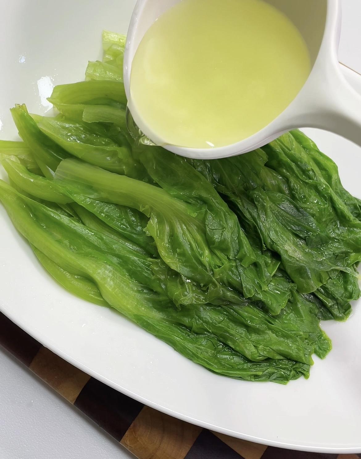 放入盘中,舀一勺烫青菜的汁水。