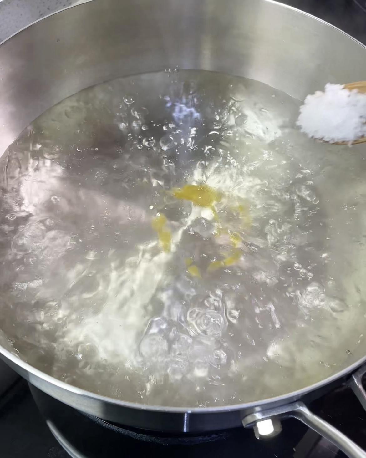 烧一锅水,水沸后加一点亚麻籽油,鸡汁,盐。