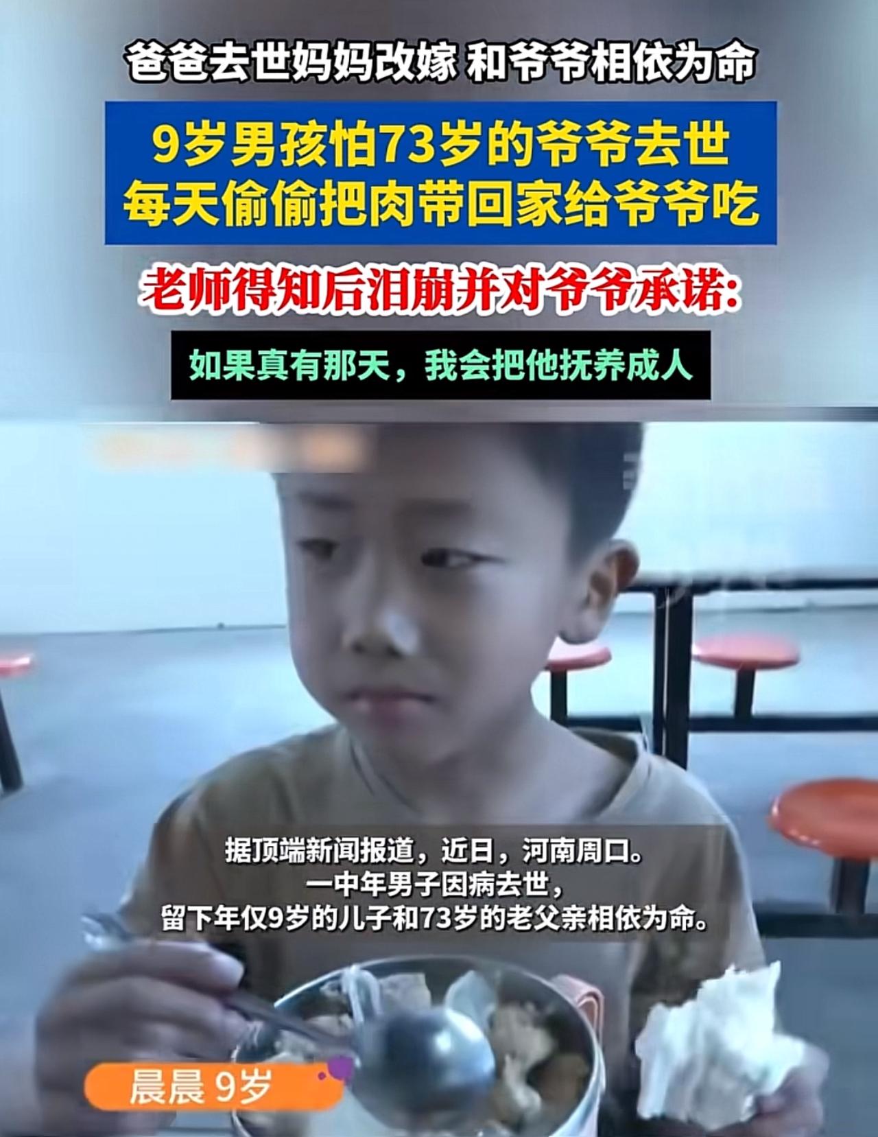 河南周口,9岁的晨晨,把学校午餐里的肉,偷偷藏起来,带回家给73岁的爷爷吃。