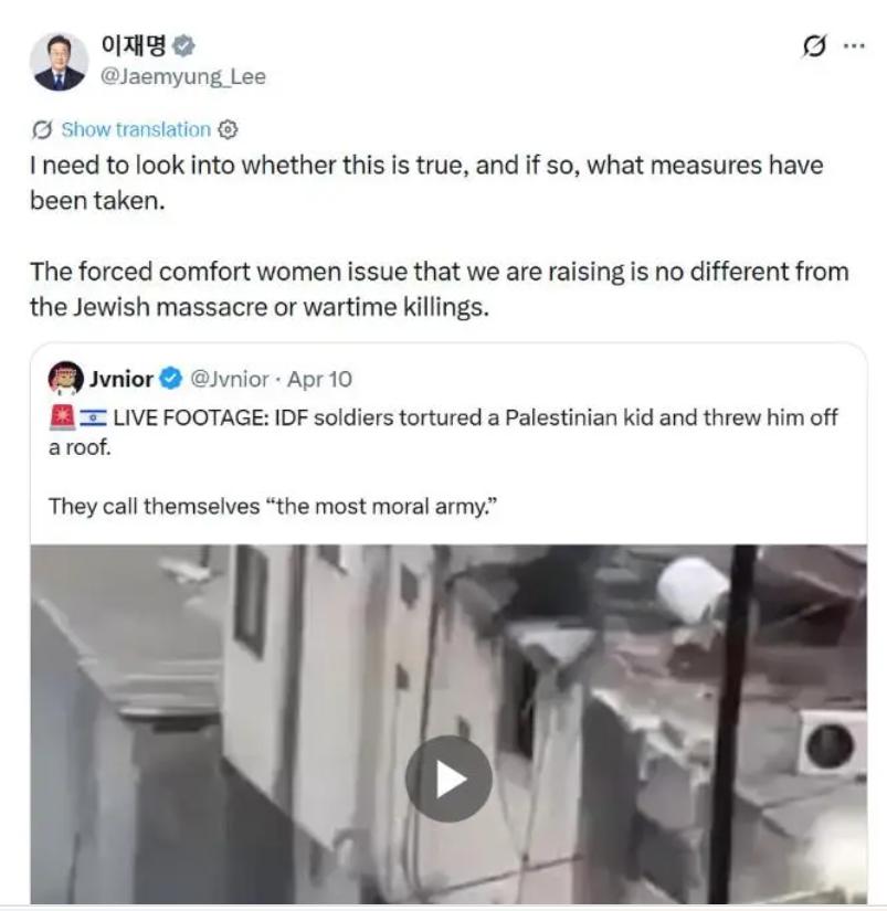 加沙的惨状一天比一天严重,国际社会的耐心早就被磨没了,挪威这声喊话,不光自己动了手,还真带动了一波连锁反应。最先炸锅的不是欧洲,而是韩国——前几天有段旧视频被翻了出来,是2024年9月拍摄的,画面里以色列士兵把巴勒斯坦人的遗体从屋顶推了下去,韩国总统李在明看到后,直接在社交软件上发声,说这种行为和当年纳粹残害犹太人没什么两样,还吐槽以色列一直干着反人权、反国际法的事,却从来不肯反思,这话直接把以色列当局气炸了,当场就公开谴责李在明的言论不可接受。