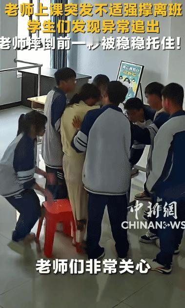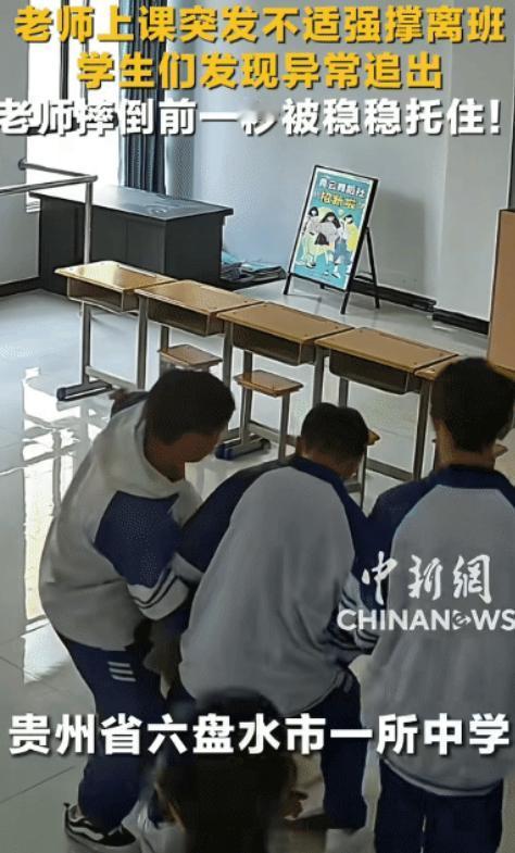 看哭了!贵州六盘水,老师上课突感身体不适,强撑着离开教室。没想到,学生们发现异常,马上追出去。他们在老师摔倒的前一秒,赶来将老师稳稳托住,查看老师情况。后面有学生去找其他老师,有学生还拿来了凳子,扶老师坐下。