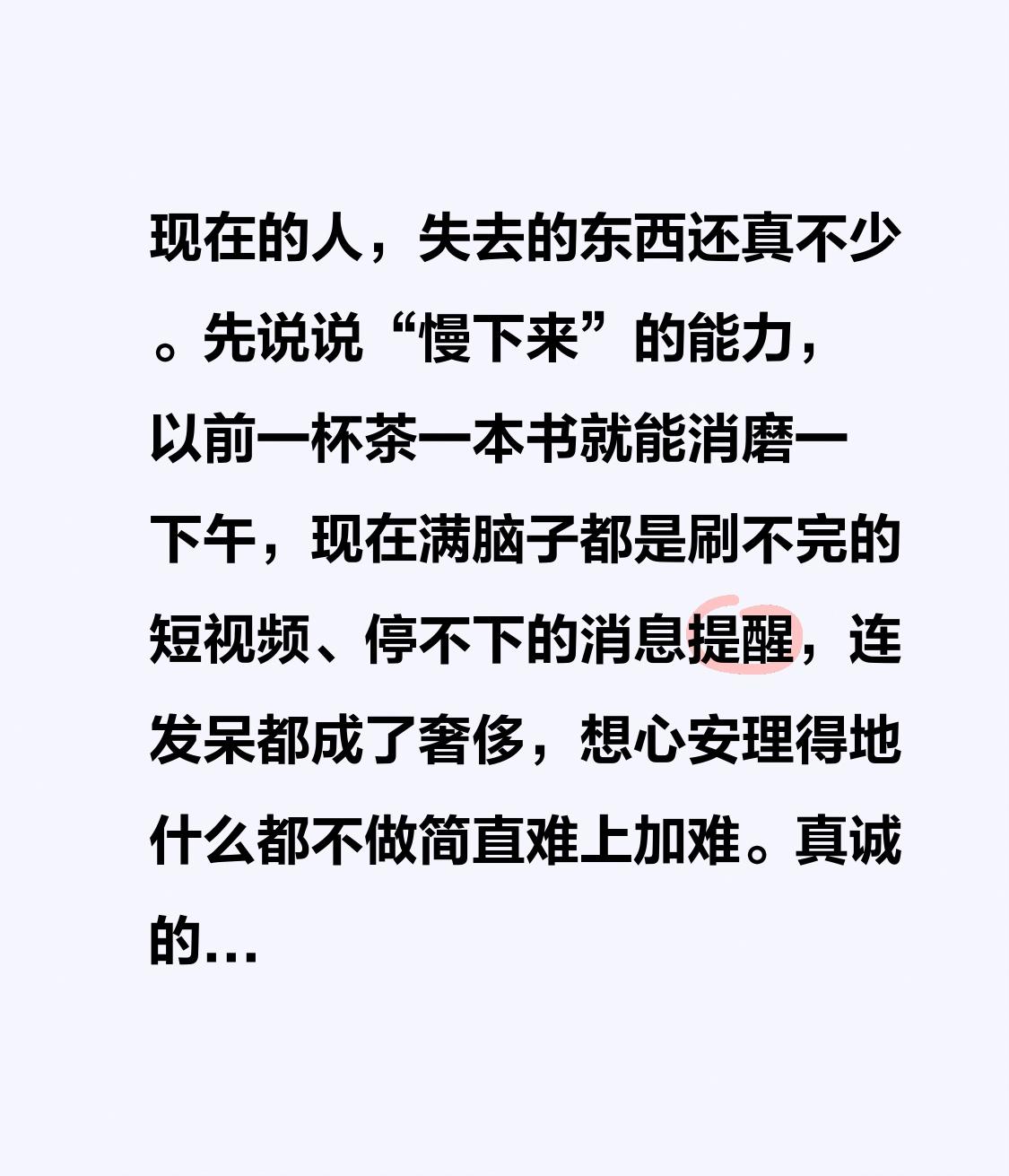 先说说“慢下来”的能力,以前一杯茶一本书就能消磨一下午,现在满脑子都是刷不完的短视频、停不下的消息提醒,连发呆都成了奢侈,想心安理得地什么都不做简直难上加难。