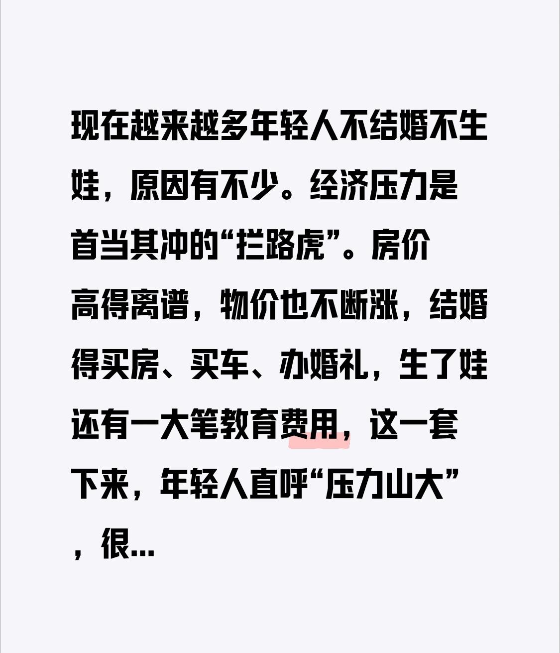 现在越来越多年轻人不结婚不生娃,原因有不少。经济压力是首当其冲的“拦路虎”。房价高得离谱,物价也不断涨,结婚得买房、买车、办婚礼,生了娃还有一大笔教育费用,这一套下来,年轻人直呼“压力山大”,很多人宁愿单着也不想背上这沉重的负担。