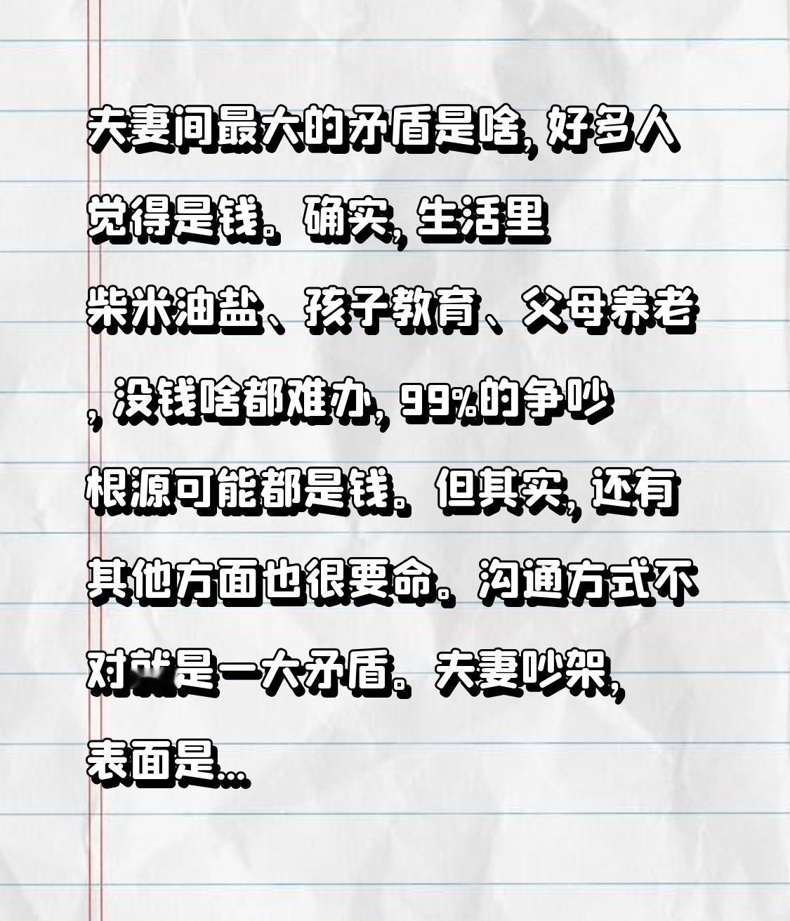 夫妻间最大的矛盾是啥,好多人觉得是钱。确实,生活里柴米油盐、孩子教育、父母养老,没钱啥都难办,99%的争吵根源可能都是钱。但其实,还有其他方面也很要命。