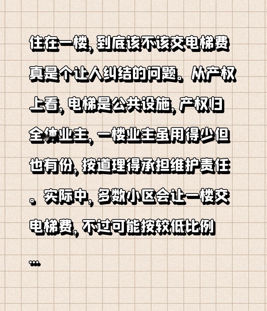 住在一楼,到底该不该交电梯费真是个让人纠结的问题。从产权上看,电梯是公共设施,产权归全体业主,一楼业主虽用得少但也有份,按道理得承担维护责任。