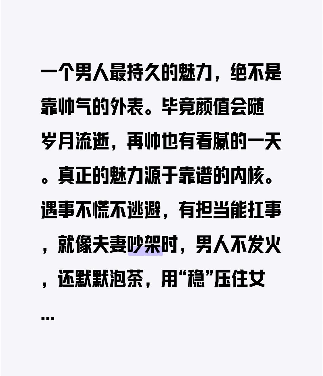 真正的魅力源于靠谱的内核。遇事不慌不逃避,有担当能扛事,就像夫妻吵架时,男人不发火,还默默泡茶,用“稳”压住女人心里的慌。待人温和有分寸,懂得尊重和体谅,能让相处变得舒服。有自己的节奏和追求,不浑浑噩噩,兜里有本事,心里有温度。这种“精神上的靠得住”,能给女人带来踏实感,不管相处多久,都魅力不减,让人着迷。