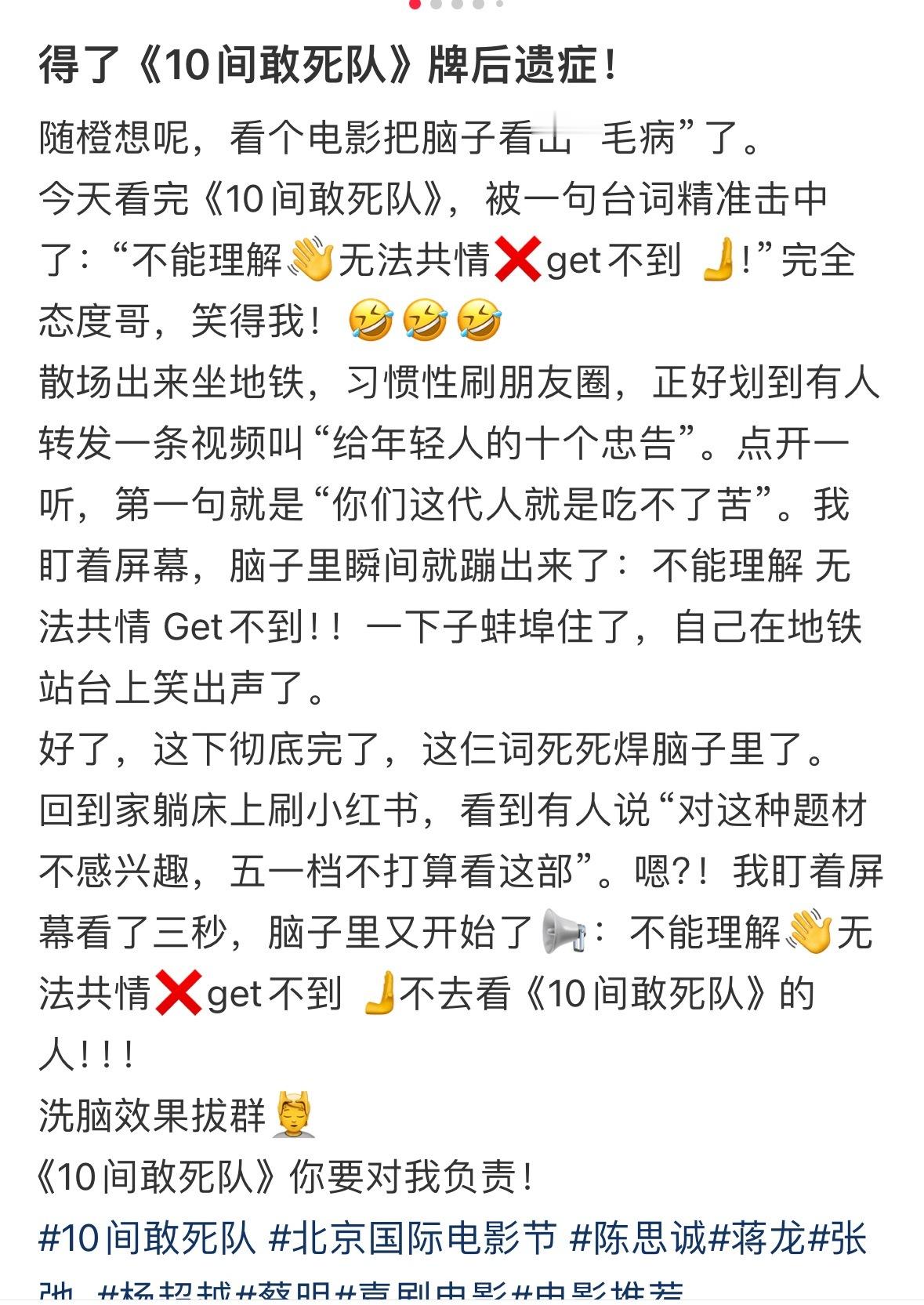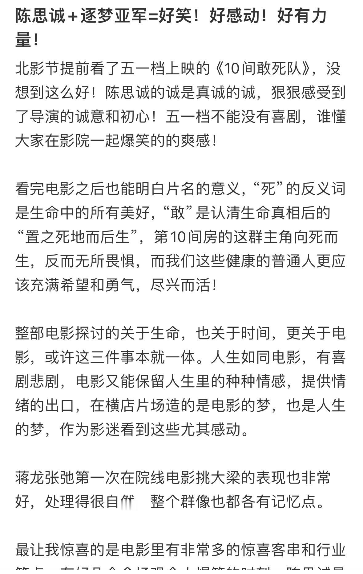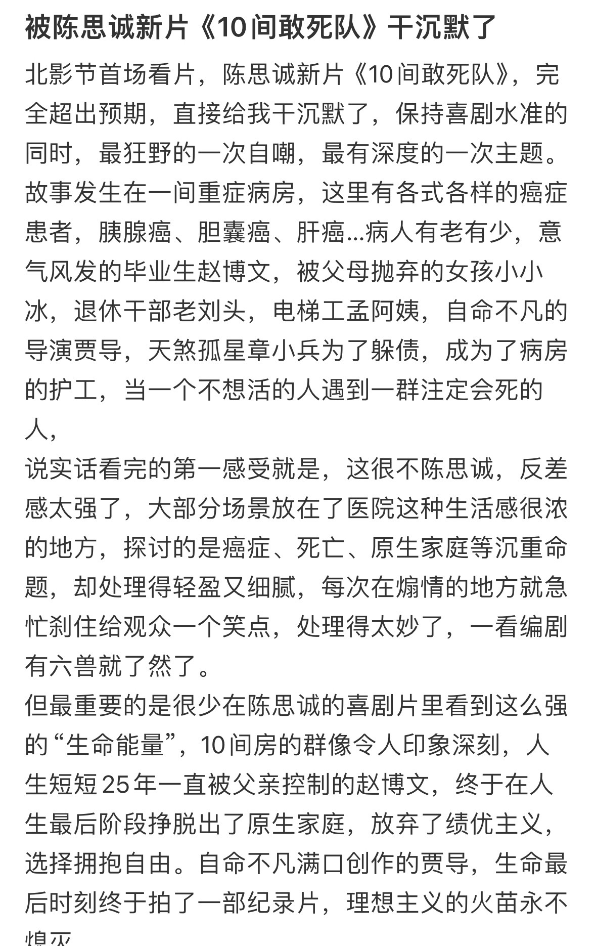 陈思诚新片口碑陈思诚新片真实口碑陈思诚还是那个陈思诚,《10间敢死队》在首场看片会大获好评。个性十足的角色构成这部片子的喜剧基石,难得的是,每个人不管是人物的弧光还是演员演技都有高光。真的像陈思诚说的很多戏是给对应演员量身定制的。