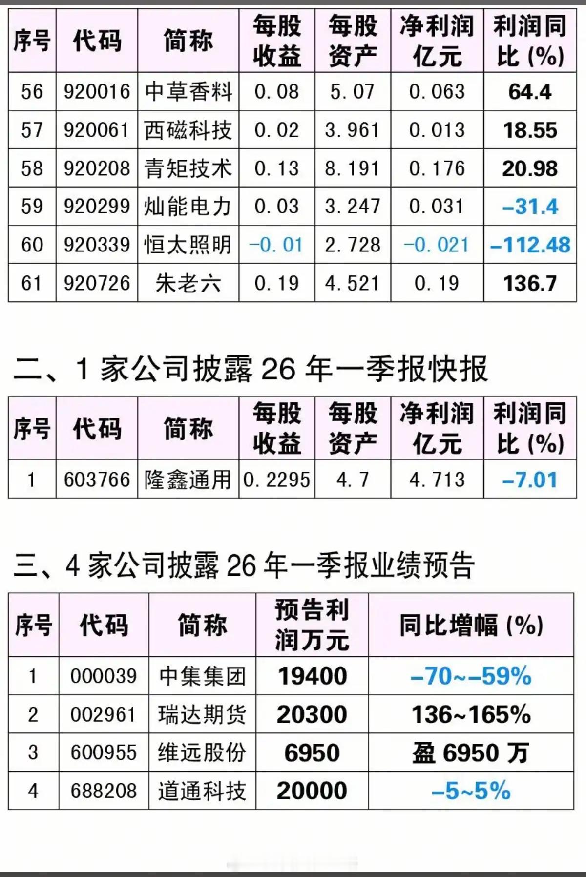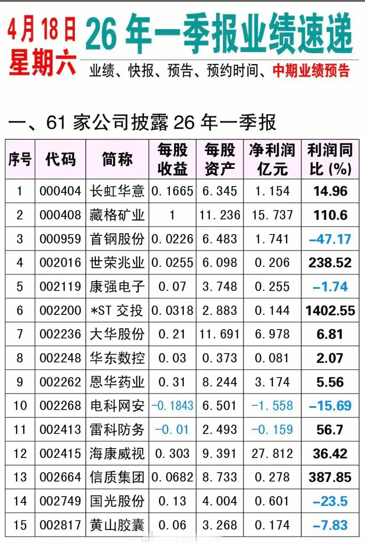 4.18周六 26年一季报业绩速递!61家公司披露一季报业绩4家公司业绩预告