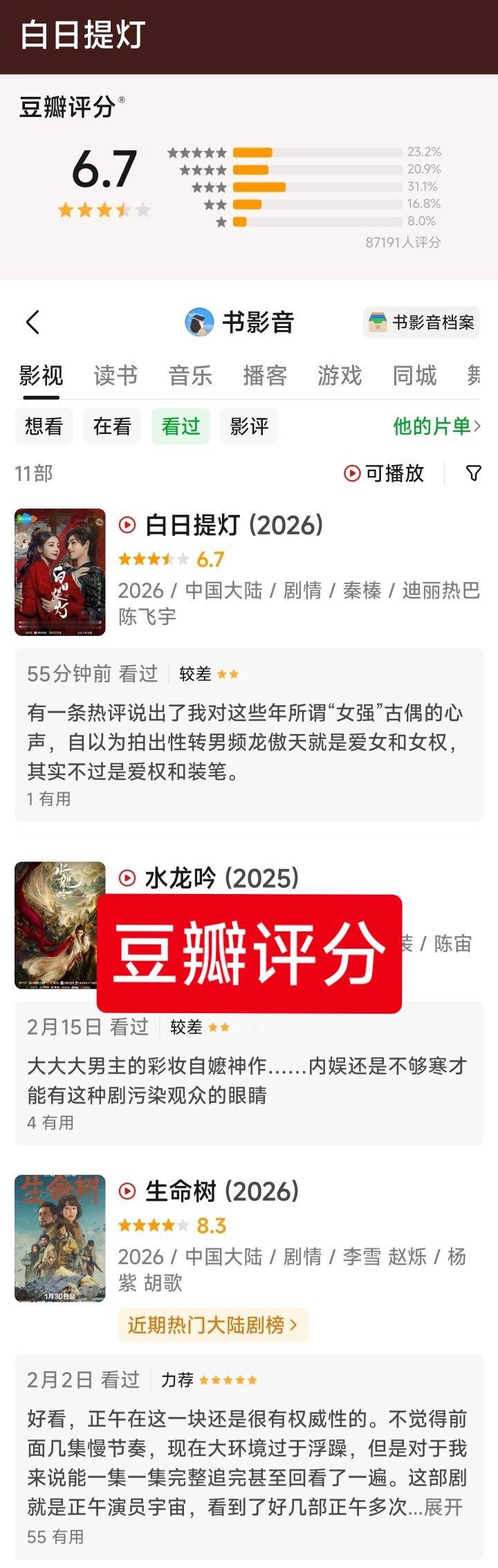 白日提灯豆瓣6.7,评论人数87171人。其中打差评的用户不仅评论了《白日提灯》,还差评了罗云熙的《水龙吟》,然后怒赞杨紫《生命树》是正午阳光的演员宇宙。
