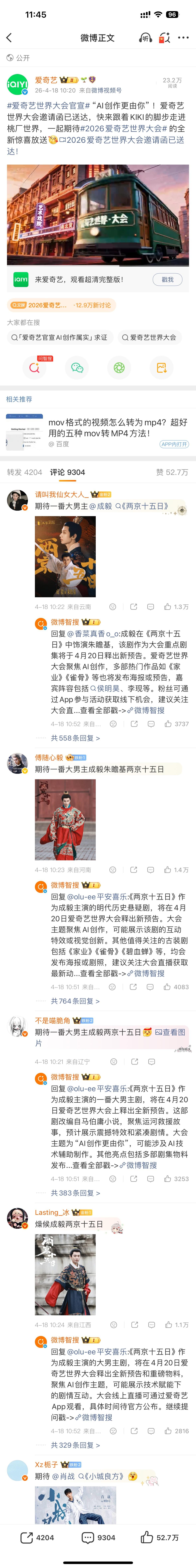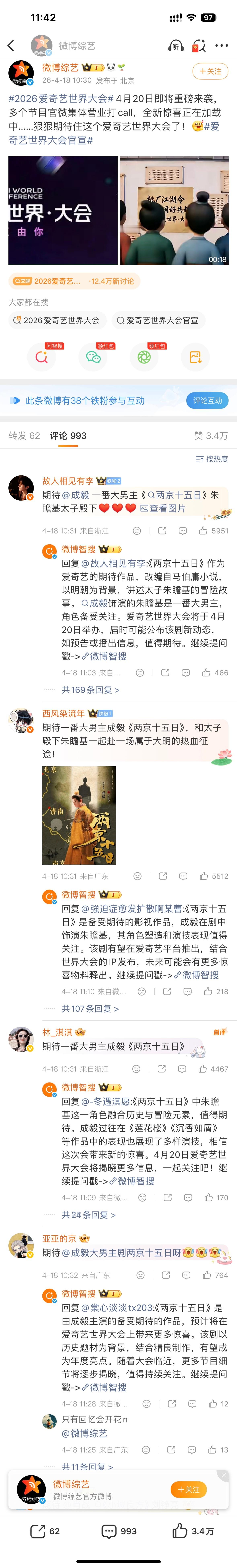 爱奇艺世界大会官宣,每条官宣博前排都是成毅粉丝,期待两京十五日!老费侠天天买氵都