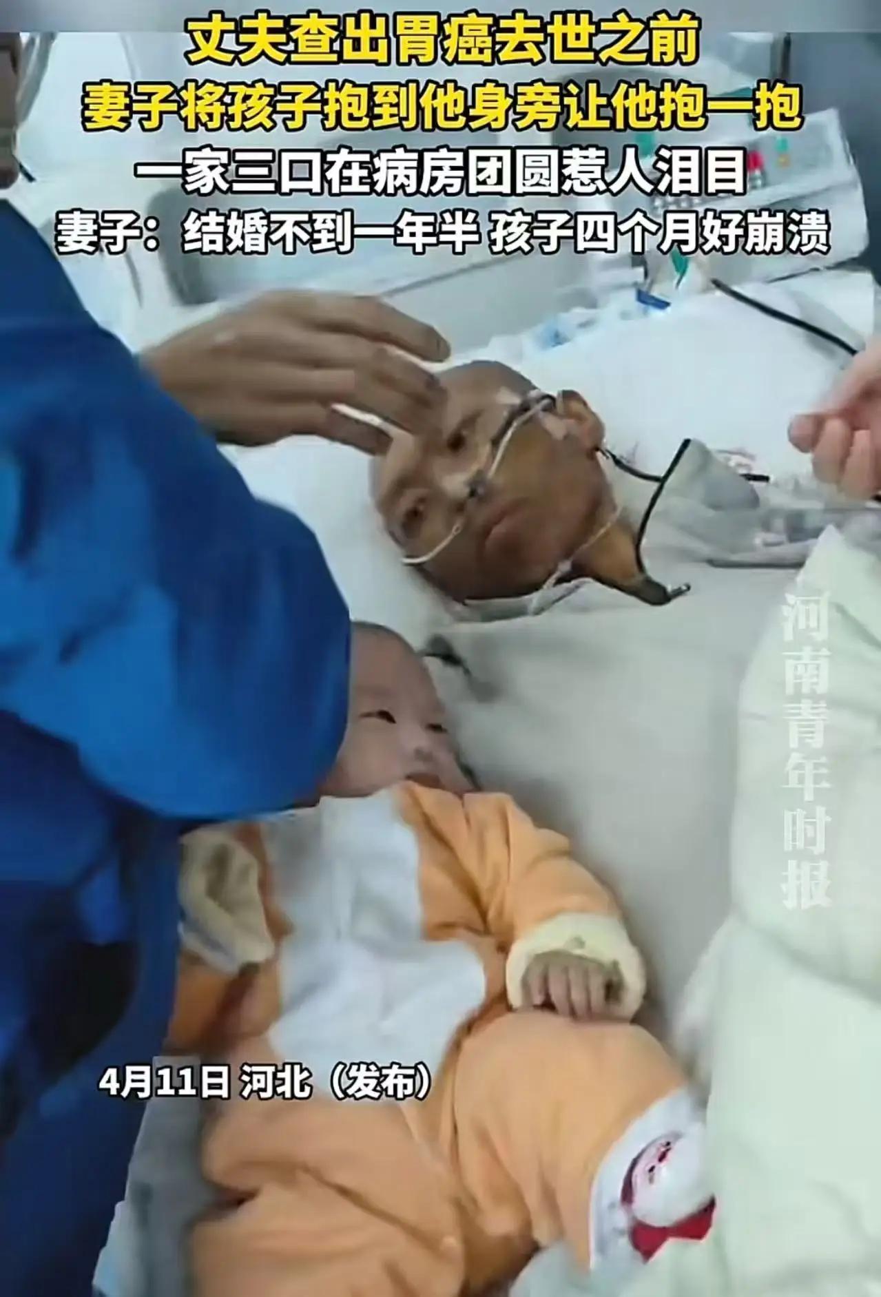 这画面,谁看了不流泪?丈夫查出胃癌去世之前,妻子将孩子抱到他身旁让他抱一抱,一家三口在病房团圆惹人泪目!妻子哽咽道:“结婚才一年半,孩子才四个月,他就要走了……”