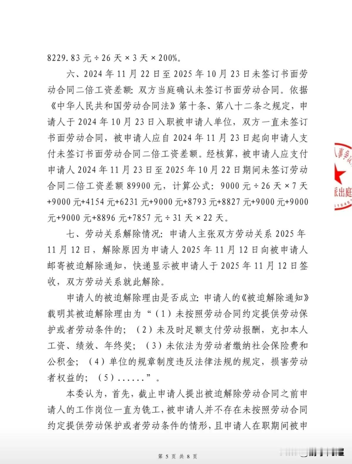 该员工任职铣床技工,入职满一年后,公司仍未与其签订劳动合同,员工遂向公司提交《被迫解除劳动合同通知书》,并就劳动争议向相关部门提起仲裁及诉讼,主张多项赔偿。