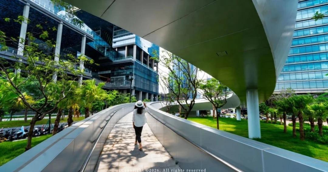 与草坪几步之遥的滨江立体公园,已成为最佳观景平台,空中连廊丝滑缝合商务区与珠江滨水空间,城市效率与生活诗意在此完美相融,互联网人在这里实现了“下楼即江景,举目皆风光”的日常理想。