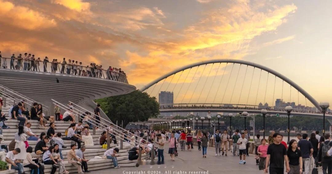 而全新升级的广州塔滨水大台阶,则彻底彰显了广州“开放与包容”的基因。无围墙、无门票,市民与游客闲坐于此,仰望“小蛮腰”璀璨,俯瞰珠江流淌。音乐声、嬉闹声、江风与低语交织——这里已成为广州最生动的“城市大阳台”。