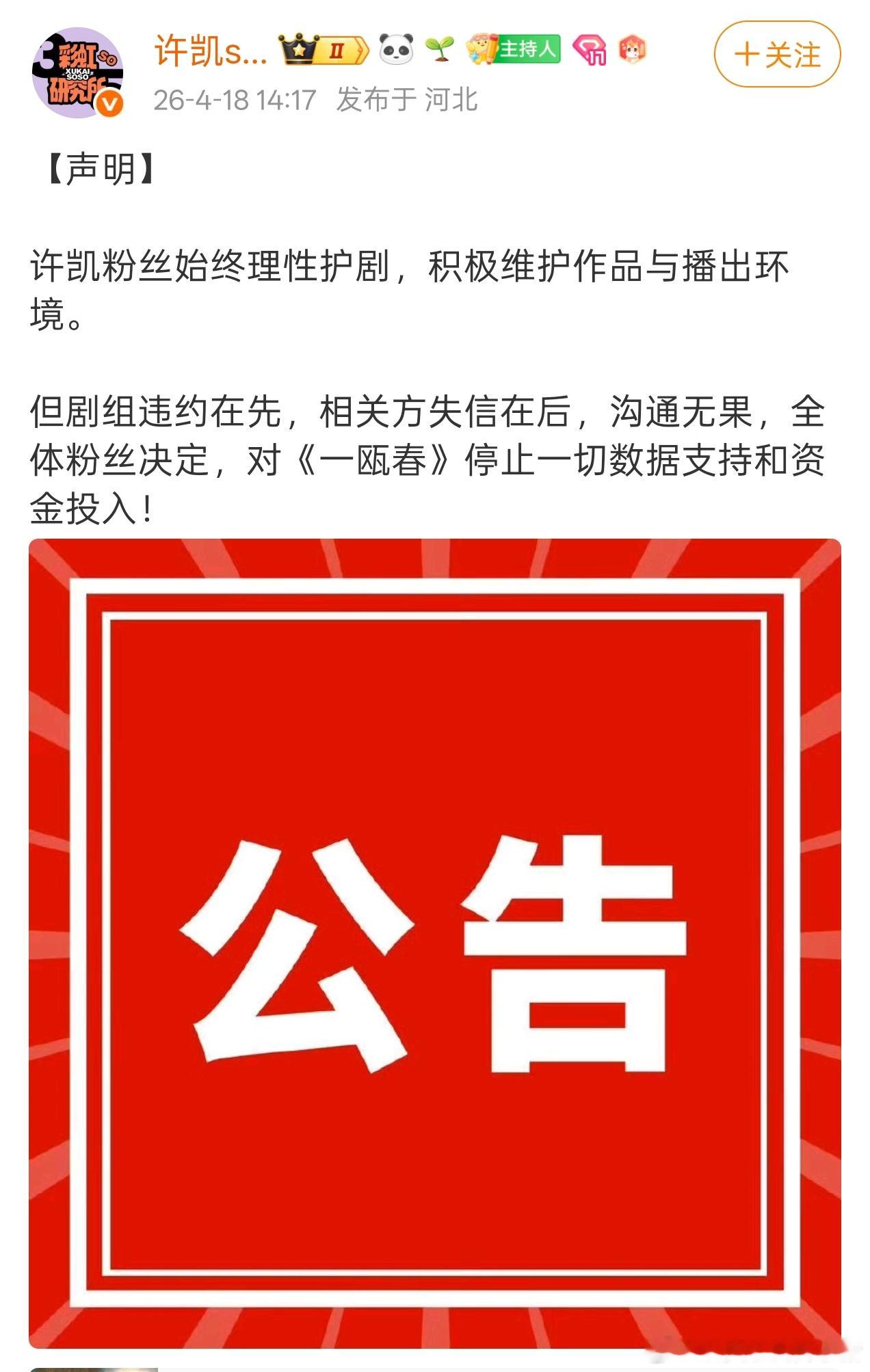 瓜主爆料一瓯春许凯周也从一番变平番了,所以迟迟不敢官宣,许凯职能站发布声明要埋剧了
