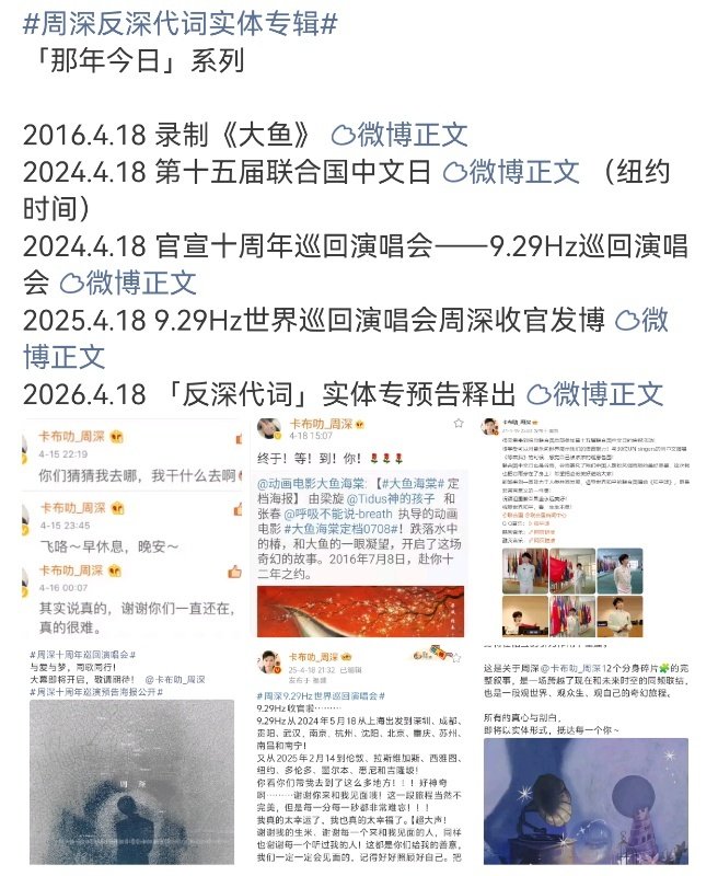 周深四月十八的含金量周深官宣仪式感 别人一年过一个生日,周深一年过一个4月18。这一天承载了他太多重要时刻:作品诞生、国际舞台、巡演起止、专辑预告……根本看不过来!😭