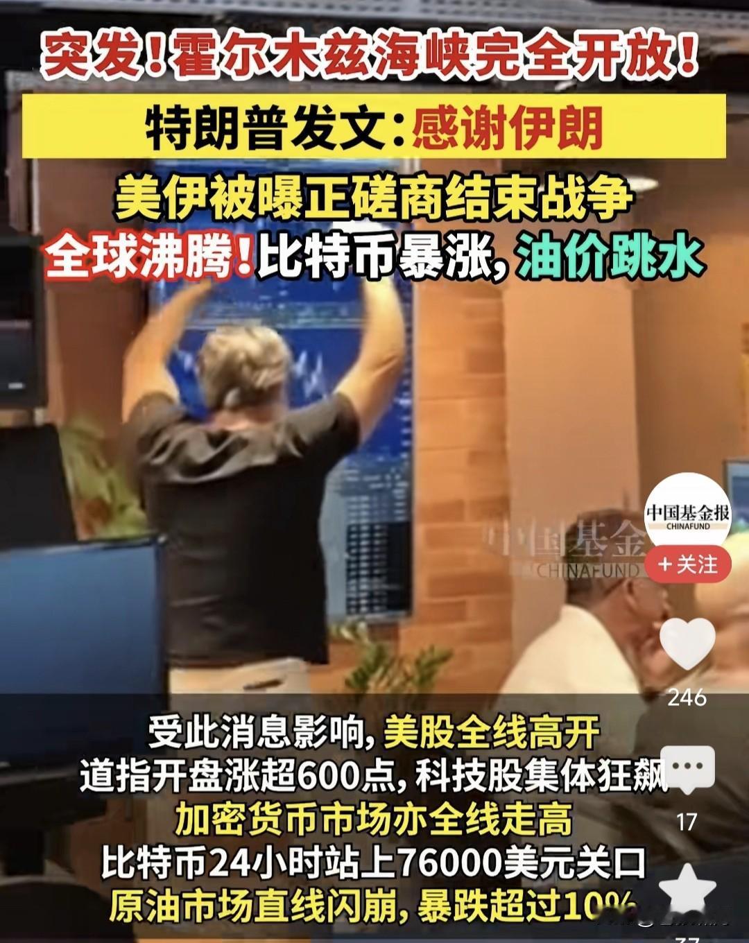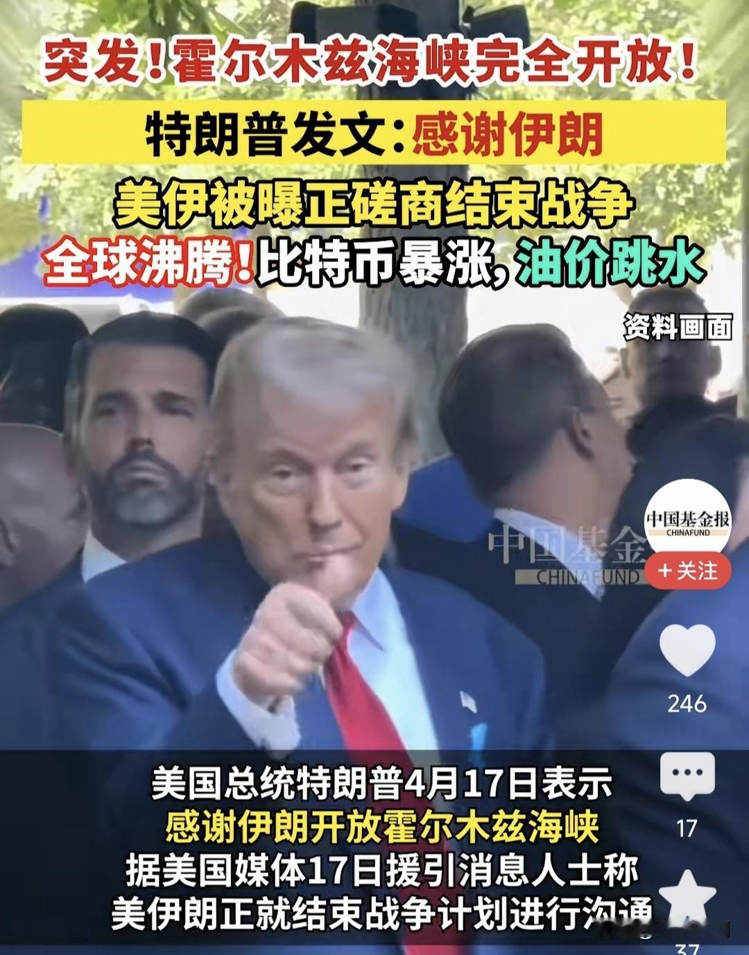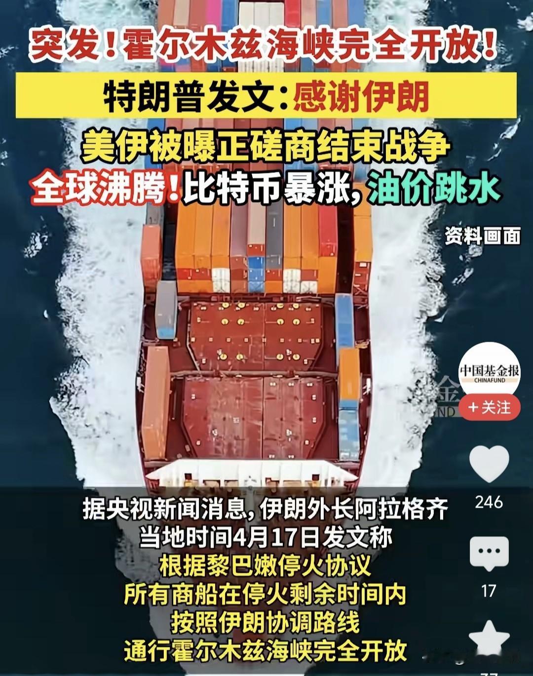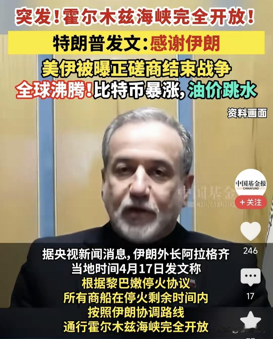 惊天喜讯:霍兹海峡重新开放!特朗普向伊朗表示感谢!网曝美伊正在磋商结束战争。油价跳水,比特币暴涨。