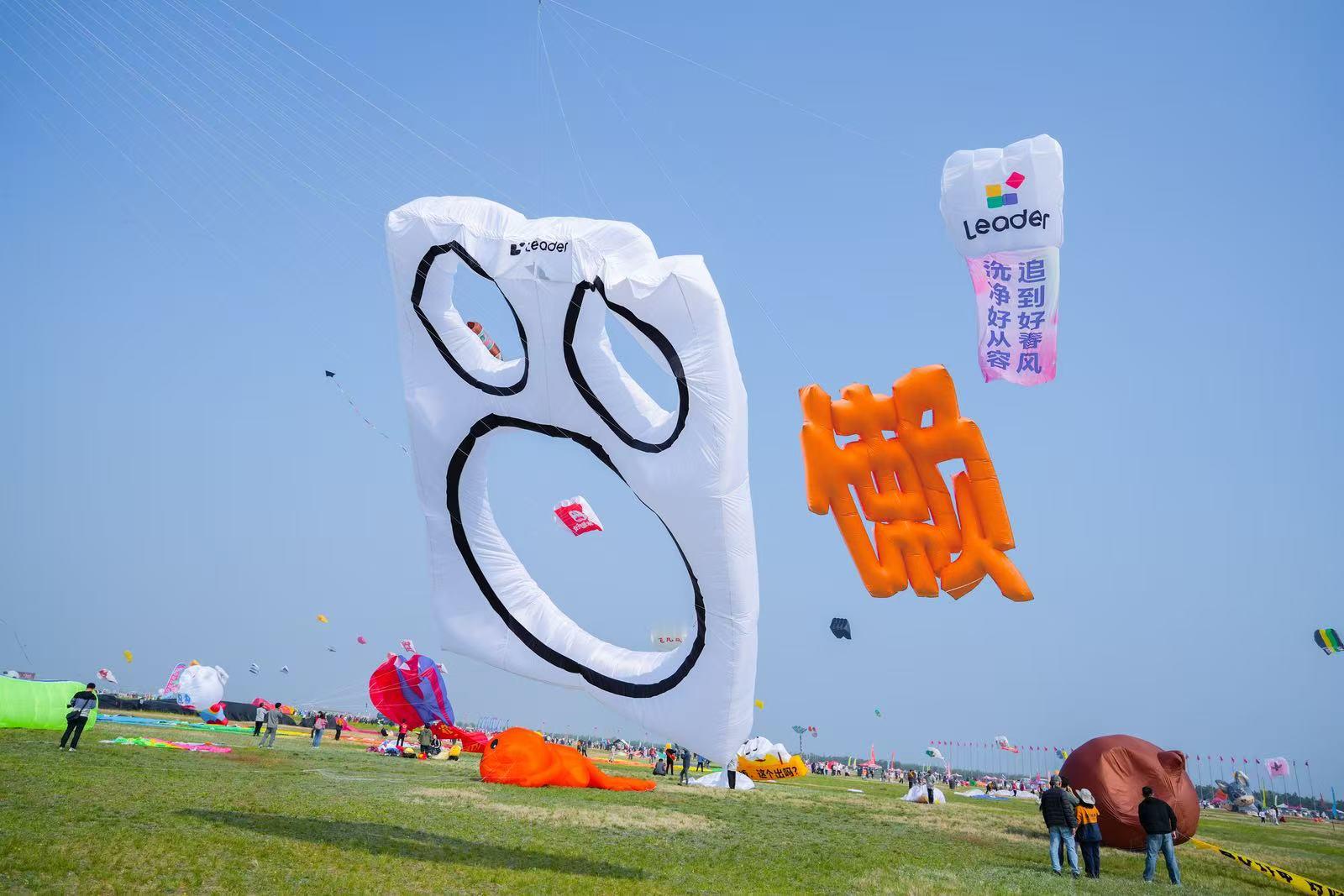 家人们!Leader 在山东潍坊风筝节放飞的那个“懒”字风筝和三筒洗衣机风筝,可
