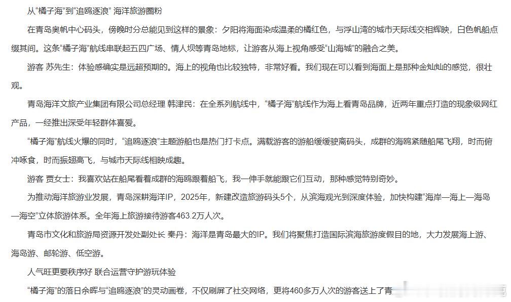 青岛这边的官方自己表态的意思是啥?靠着美丽的“橘子海”景色,青岛海洋文旅产业集团有限公司总经理 韩津民表示“橘子海”航线作为海上看青岛品牌,是近两年重点打造的现象级网红产品,一经推出深受年轻群体喜爱。