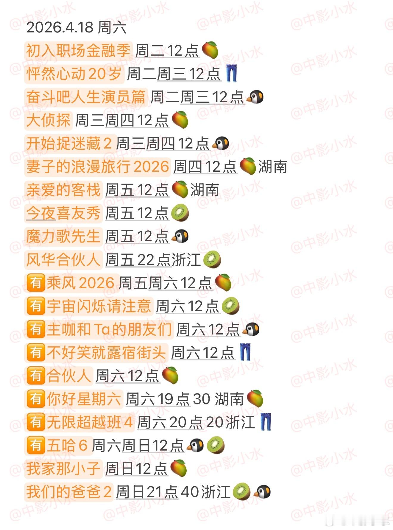 🈶乘风2026 🈶宇宙闪烁请注意 🈶主咖和Ta的朋友们 🈶不好笑就露宿街头 🈶合伙人 🈶你好星期六 🈶无限超越班4 🈶五哈6