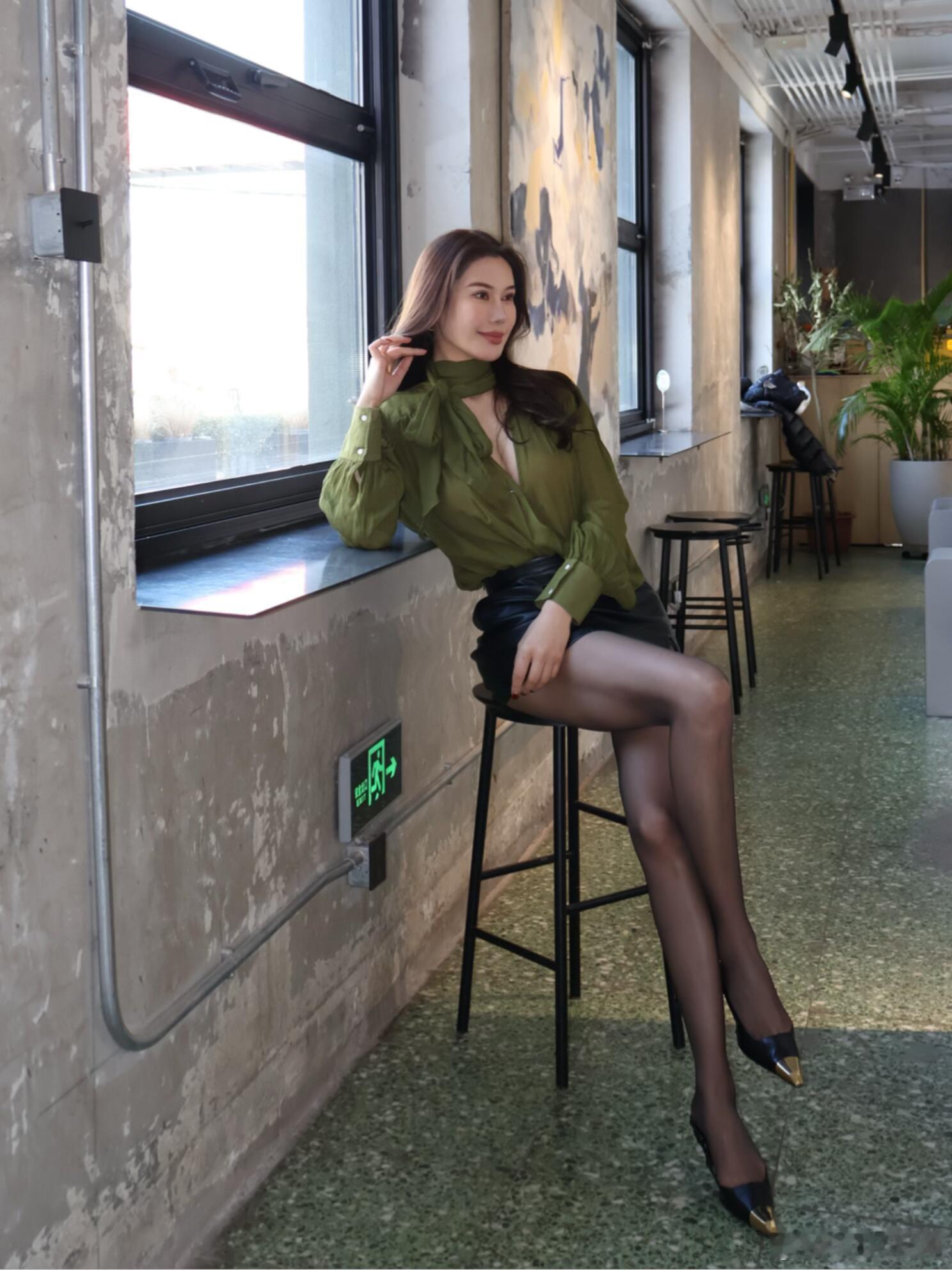 牛油果绿裹着温柔,黑皮裙藏着锋芒。