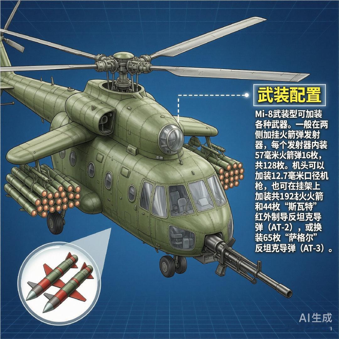 Mi-8武装型可加装各种武器。一般在两侧加挂火箭弹发射器,每个发射器内装57毫米火箭弹16枚,共128枚。机头可以加装12.7毫米口径机枪,也可在挂架上加挂共192枚火箭和4枚“斯瓦特”红外制导反坦克导弹(AT-2),或换装65枚“萨格尔”反坦克导弹(AT-3)。