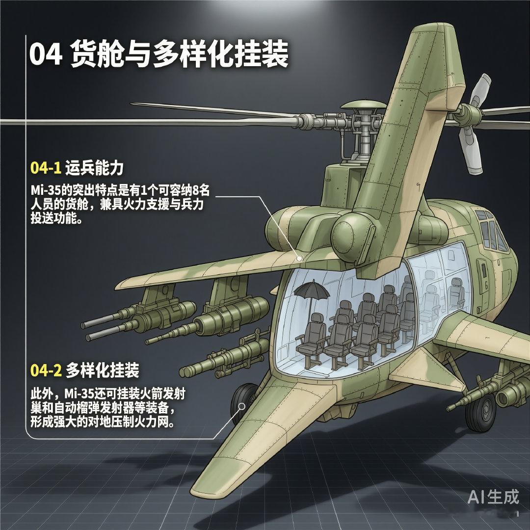 Mi-35驾驶座舱采用经典的串列布局,并受防弹玻璃保护,油箱采用防渗漏技术,战场生存能力十分突出。该机采用了5片矩形桨叶旋翼,垂尾式的尾斜梁,尾桨为3片桨叶。Mi-35的突出特点是有1个可容纳8名人员的货舱,最大起飞重量超出Mi-8武装型一倍。