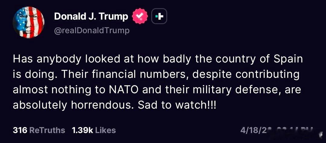 兄弟们,川普换套路了,正面怼不过,开始侧面出击!川普嘲笑西班牙的经济差,结果你猜