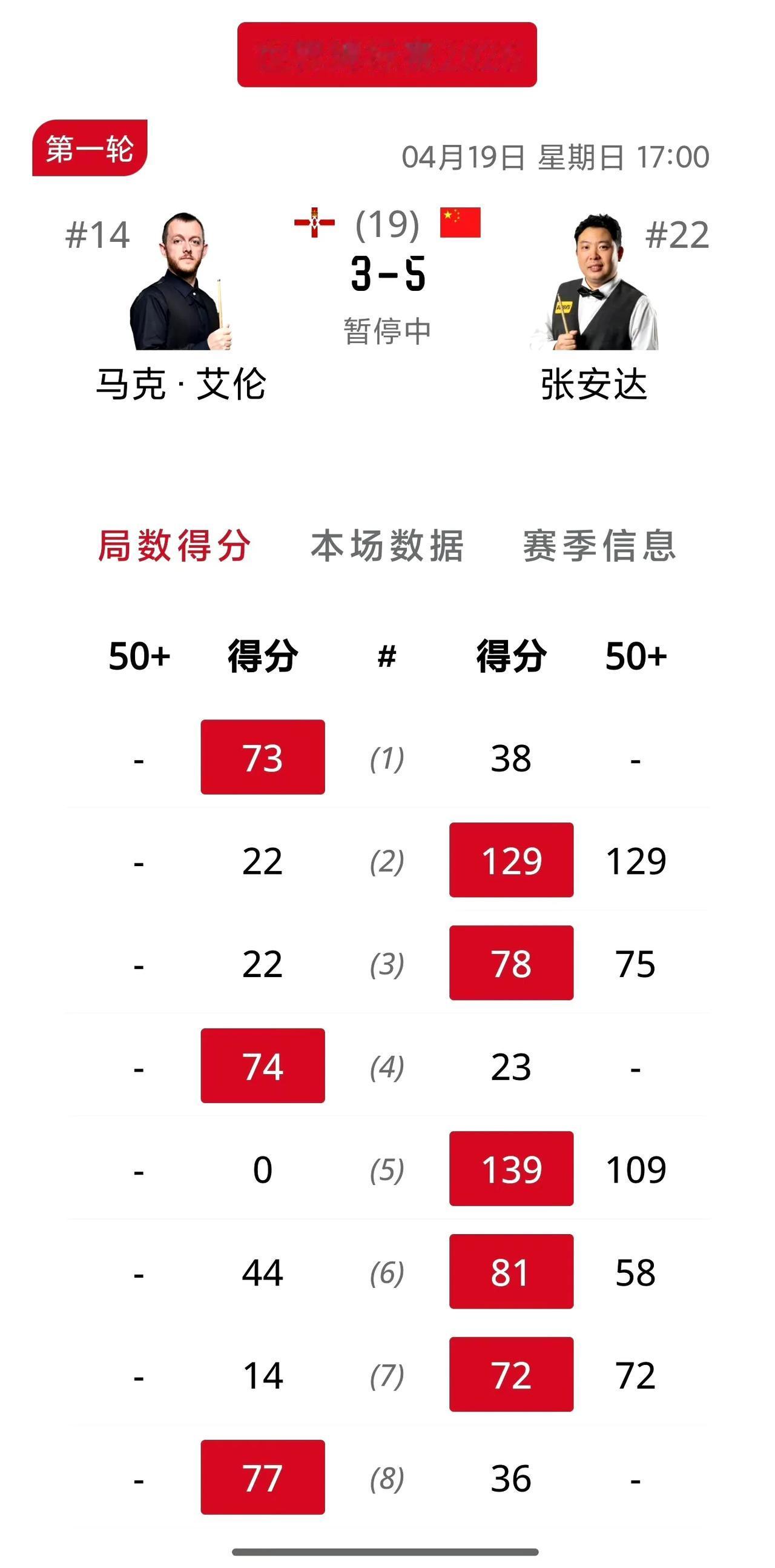 中国军团全面出击!斯诺克世锦赛正式开幕,下午场的比赛卫冕冠军赵心童率先登场,面对资格赛排名最低的海飞丝打的磕磕绊绊,状态令人担忧,好在最后一局对手失误,拿到了领先优势,难道第一轮就要爆冷吗?而另一边达仔还比较让人放心,轰出五杆单杆高分,暂时领先艾伦,非常有机会……