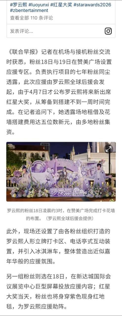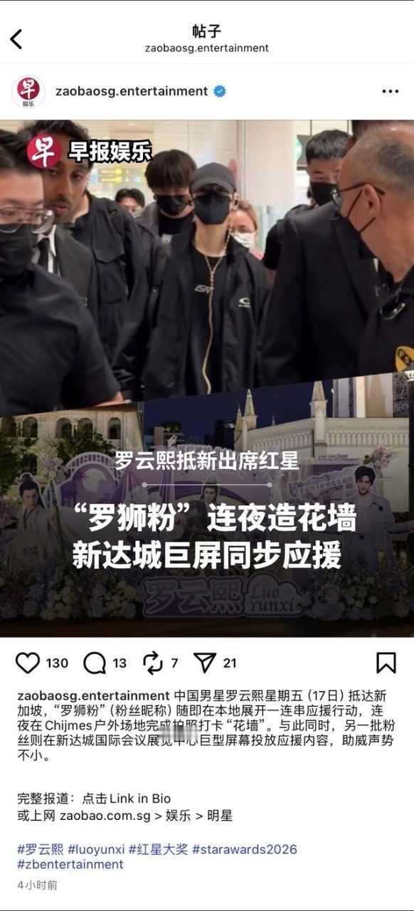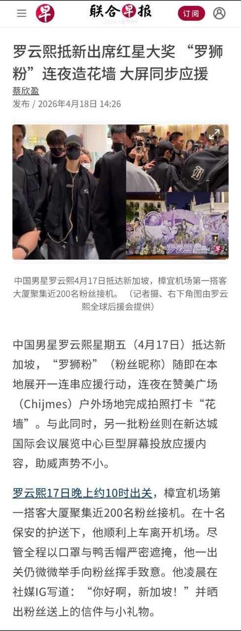 新加坡最大华文报纸《联合早报》头版官宣其行程,评价其为“中国文化在东南亚最成功的符号”;新传媒罕见主动公开航班信息号召接机,娱乐媒体Vibes更直言“罗云熙=新加坡最火中国演员,没有竞争对手”。