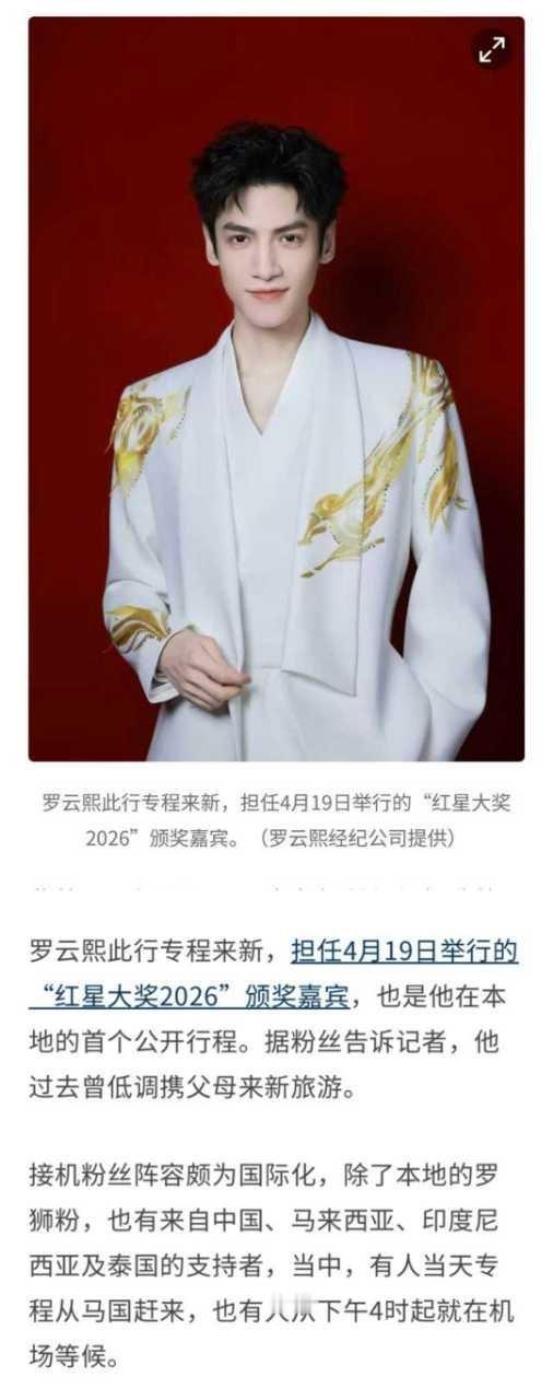 罗云熙受邀以“颁奖+表演”双嘉宾身份出席新加坡红星大奖2026,成为该奖项创办32年来首位获此殊荣的内地艺人,其抵达新加坡引发的接机盛况、粉丝应援及国际影响力引发全球关注。