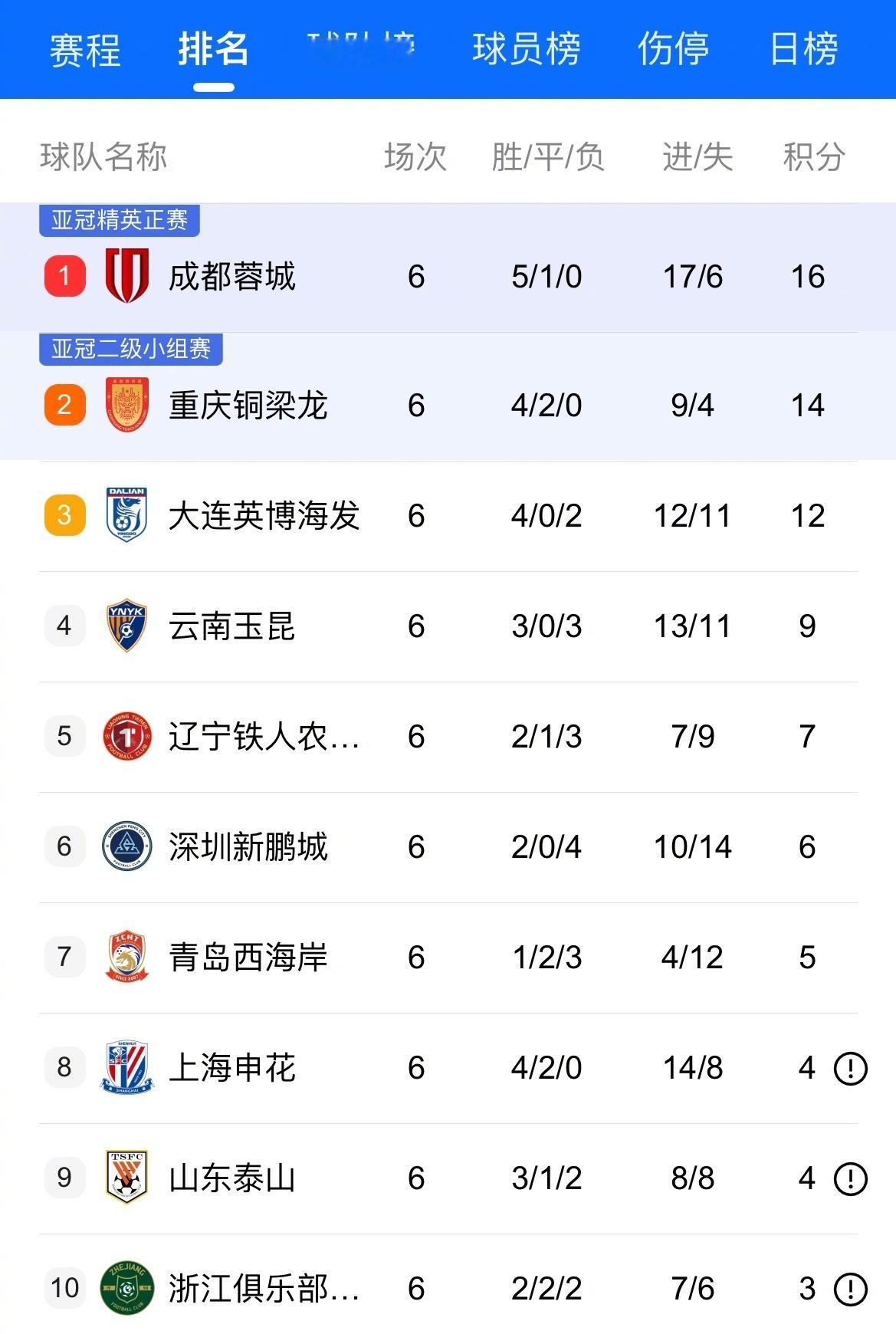 中超第6轮打完,成都蓉城拿16分继续领跑,稳坐榜首!重庆铜梁龙、大连英博排在二三