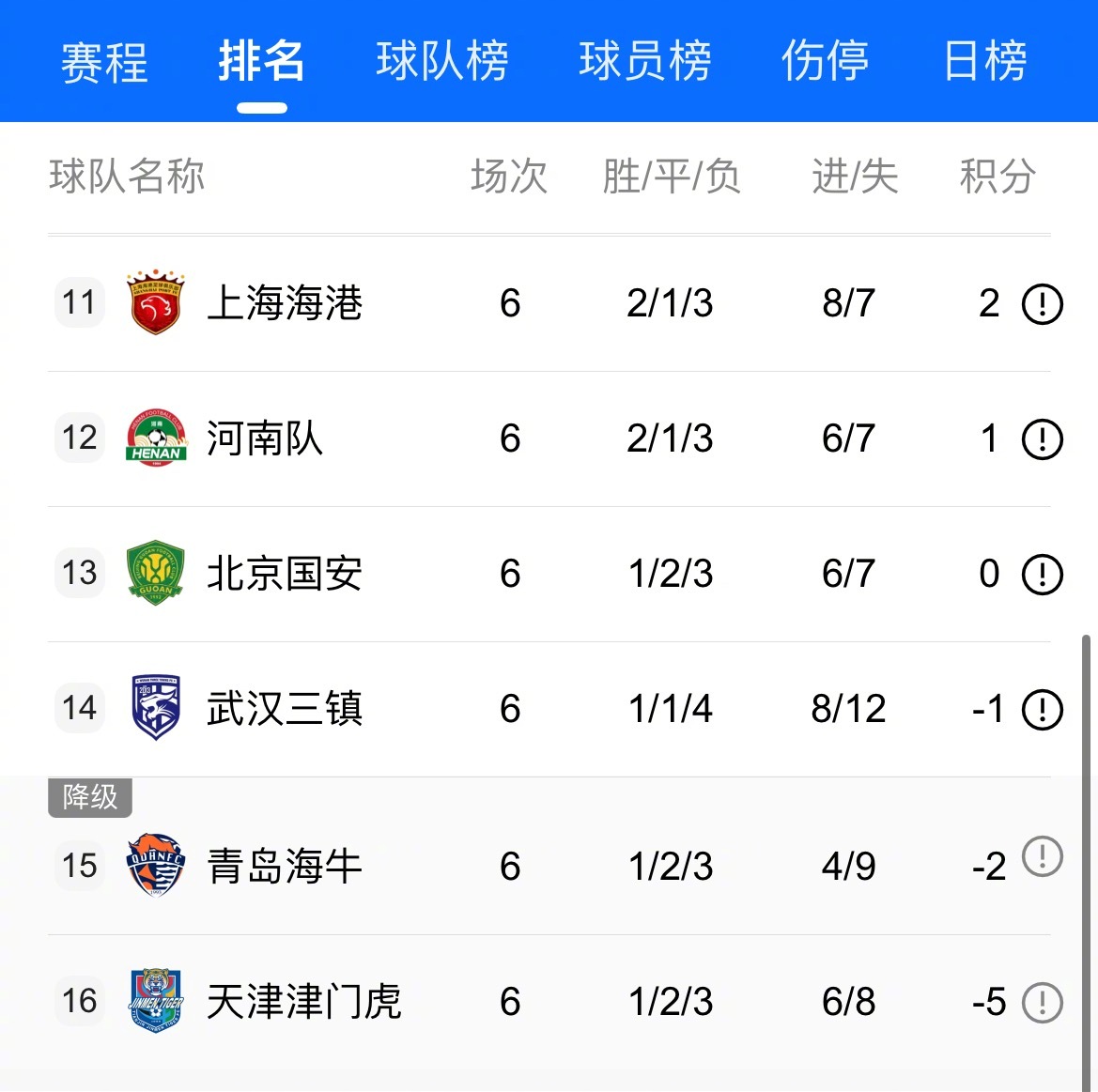 中超第6轮打完,成都蓉城拿16分继续领跑,稳坐榜首!重庆铜梁龙、大连英博排在二三位,上海申花升到第8。武汉三镇、青岛海牛、天津津门虎还是负分,处境不太妙。中超联赛