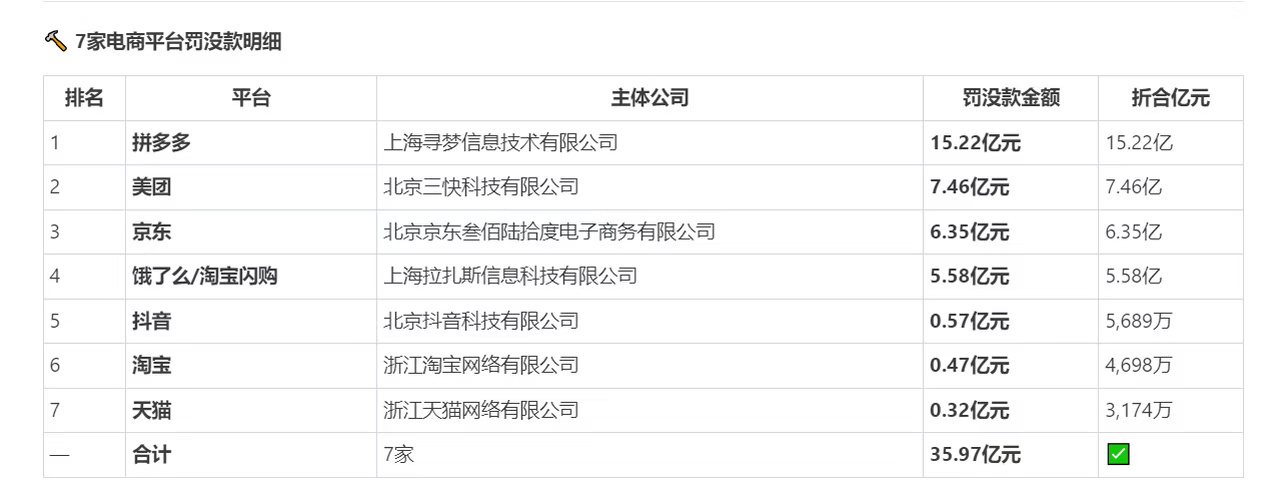 没想到的是,一个无证小作坊生产的蛋糕,居然牵出7大平台35.97亿天价罚单。拼多多、美团、京东、饿了么、抖音、淘宝、天猫7大主流平台,共计存在67604家无资质、无实体的“幽灵外卖店铺”,平台默许资质造假、违规转单、转包等违法行为,放任食品安全风险。