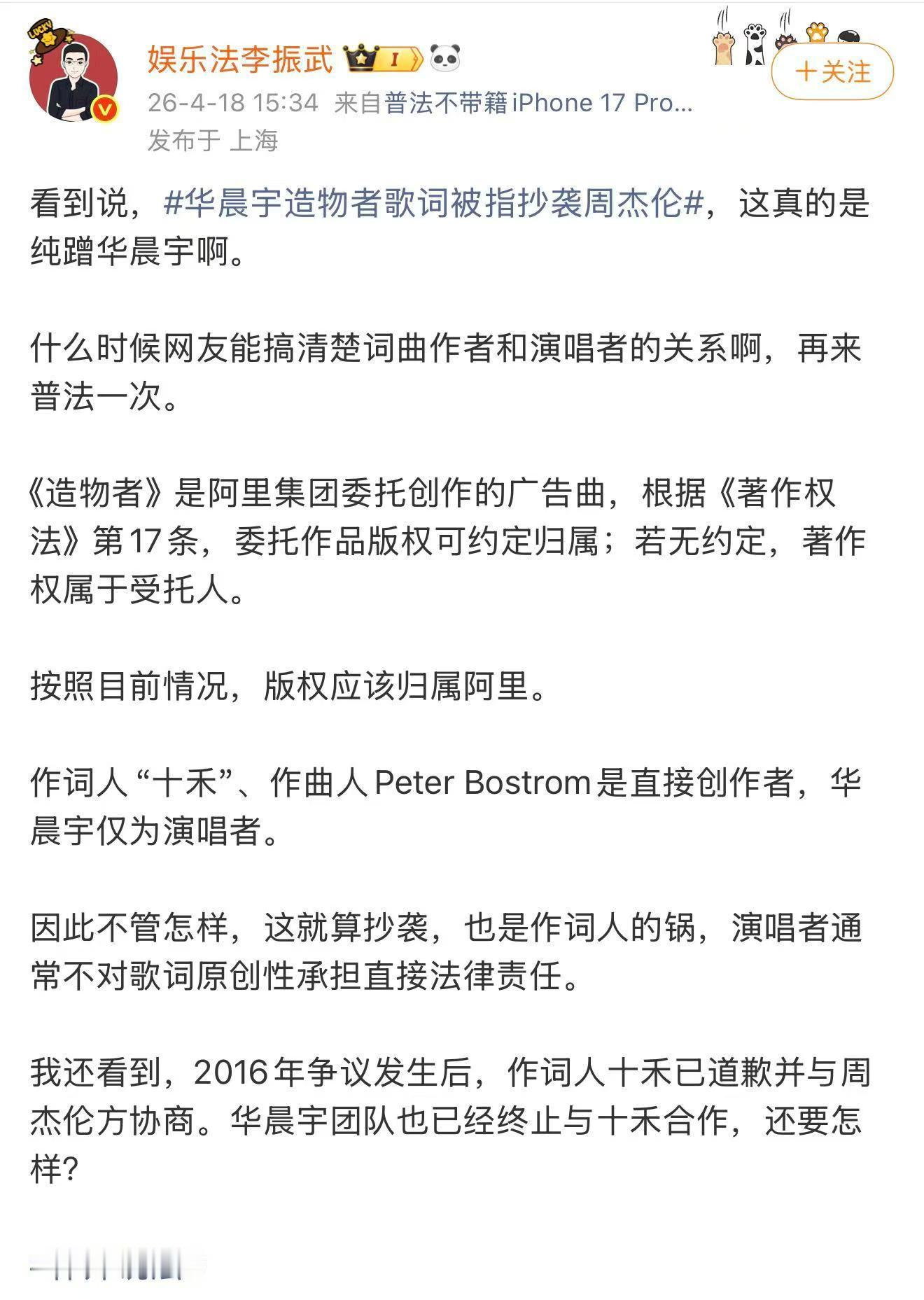 律师称造物者抄袭与华晨宇无关 律师说的很清楚了,《造物者》是广告合作曲,华晨宇只是演唱者,不是责任主体,谁创作谁负责,别把演唱者当靶子