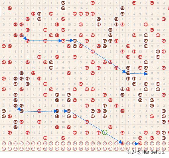 上部分形态,1路号码46.49.52定位,横推一位到0路54号,再以54号定位,隔期出0路57.60,再隔期同出0路号码63.66。