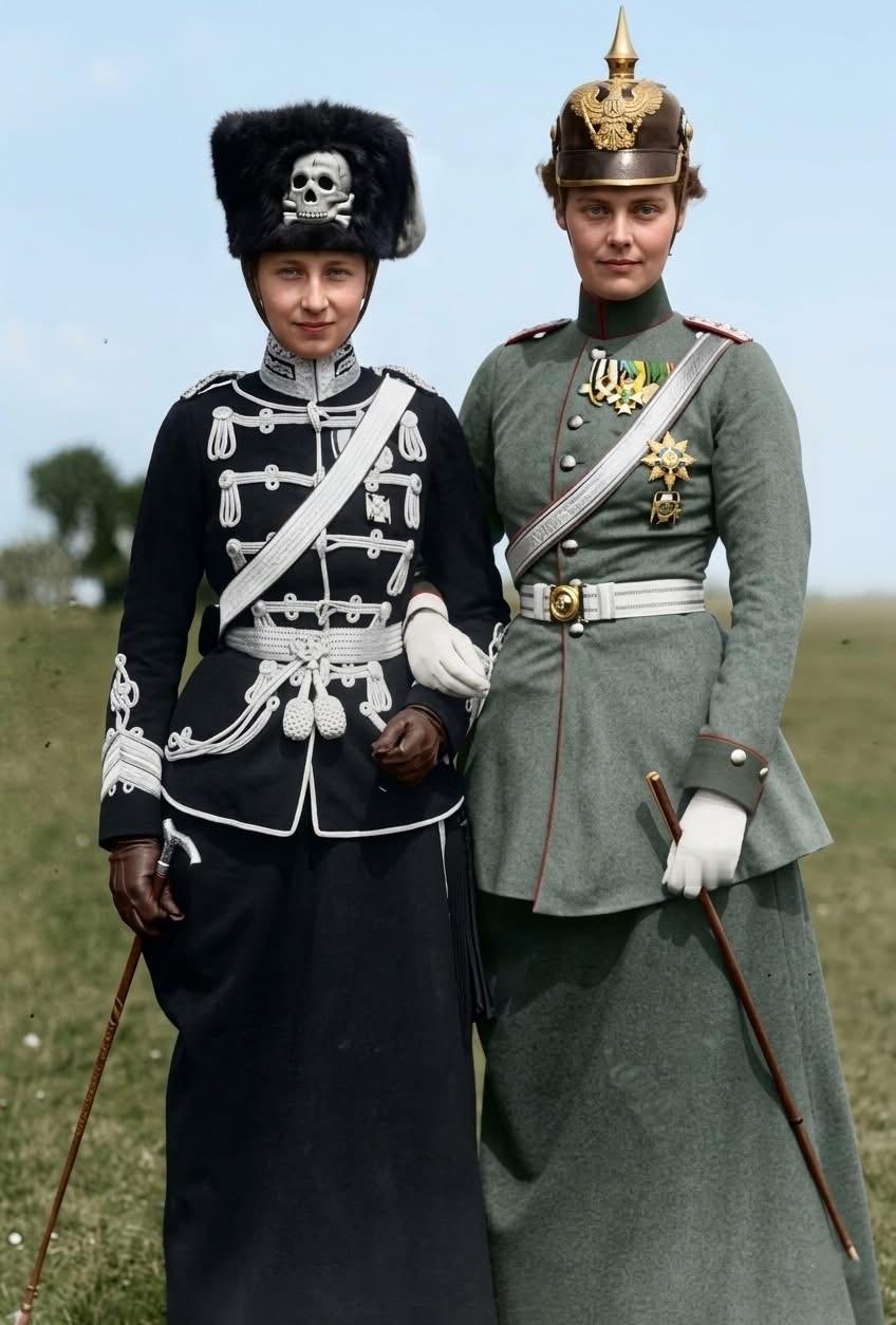 路易丝公主是德意志末代皇帝威廉二世的独生女,也是最小的孩子。塞西莉则是德国皇储威廉王子妻子。照片中两位女性均身着与普鲁士军团相关的荣誉军装:路易丝‌身着“骷髅骠骑兵”制服,头戴标志性的毛皮帽,帽顶饰有骷髅徽章;塞西莉‌则身着龙骑兵军团制服,佩戴典型的‌皮克勒豪伯‌尖顶盔,这是普鲁士与巴伐利亚军官的标志性头饰。