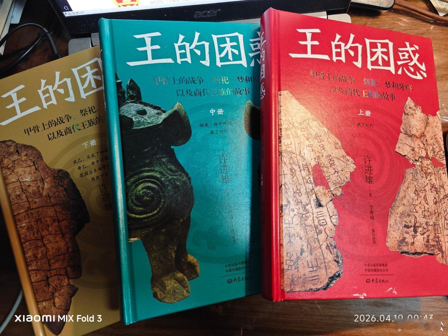 朋友送我一套珍贵的书,大概是要鼓励我与疾病作斗争,精装的三册,全价要三百九十八块钱,京东上也要卖二百四十块,我自己舍不得买,书叫《王的困惑:甲骨上的战争、祭祀、梦和牙疼以及商代王族的故事》,我以为是历史通俗演义,但仿佛更像是学术著作,作者许进雄是多伦多大学、台大、世新大学的教授,著名甲骨文专家,这本书的台版原名叫《揭秘甲骨文》,全书选了几百版甲骨,逐个解读上面刻的文字。河南大象出版社今年出版简体汉字版时,把它改成了《王的困惑:甲骨上的战争、祭祀、梦和牙疼以及商代王族的故事》的书名。许进雄教授已于去年去世。我因为大学选修过商周考古,所以对甲骨文感兴趣。甲骨文据说发现了四千多个字,但仅识别出一千多个。今后用人工智能来辨认,会不会有意外收获?