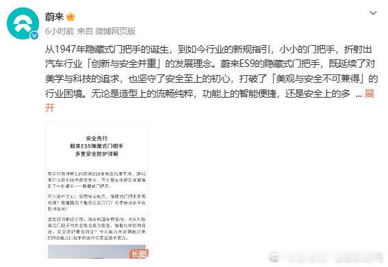 蔚来回应ES9仍用隐藏式门把手蔚来今天终于正面回应新国标下隐藏式门把手的争议了!我整理了几个关键信息,看完瞬间不慌了首先划重点:现在买的蔚来全系都能用隐藏式门把手,完全合规! 新国标不是马上一刀切,有明确过渡期 ——2027 年 12 月 31 日前上公告的新车、2028 年 12 月 31 日前出厂的现款 / 改款车都能正常用,2029 年才要求所有车型都符合新规。而且蔚来深度参与了新国标制定,一直把安全放第一位,在售车型安全性早就通过严苛测试,出事故时门把手会第一时间解锁,还有多重机械解锁保障。说实话,我之前也担心过隐藏式门把手的安全问题,尤其看到一些事故里车门打不开的新闻,真的后怕。但这次蔚来把时间节点和安全保障说清楚了,感觉踏实多了。你怎么看隐藏式门把手?是觉得科技感重要,还是安全优先?