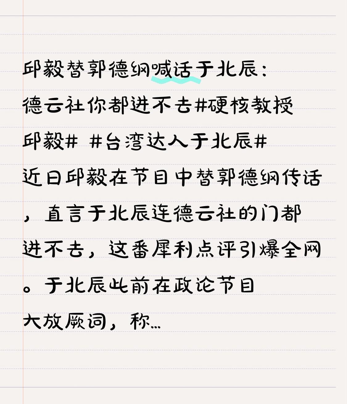 硬核教授邱毅 近日邱毅在节目中替郭德纲传话,直言于北辰连德云社的门都进不去,这番犀利点评引爆全网。
