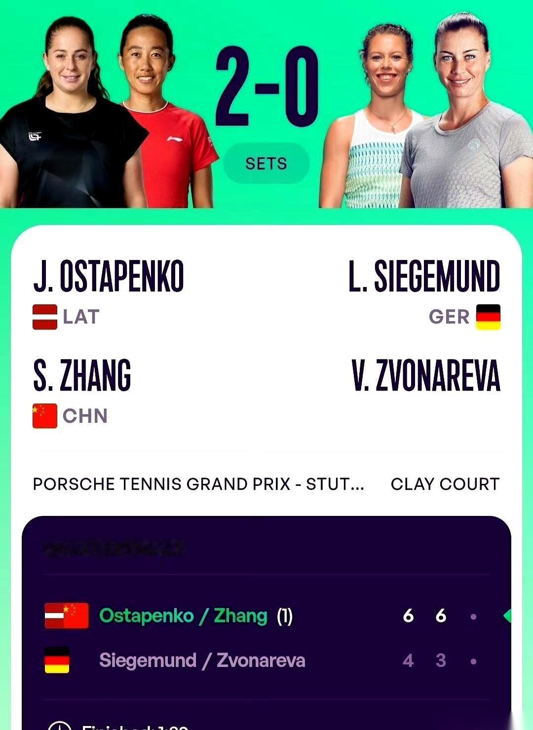 对面的西格蒙德和兹沃娜列娃显然没撑住。两盘比赛下来,张帅这一组头号种子打得极顺,几乎没给对方反扑的机会,干净利落地拿下了比赛。