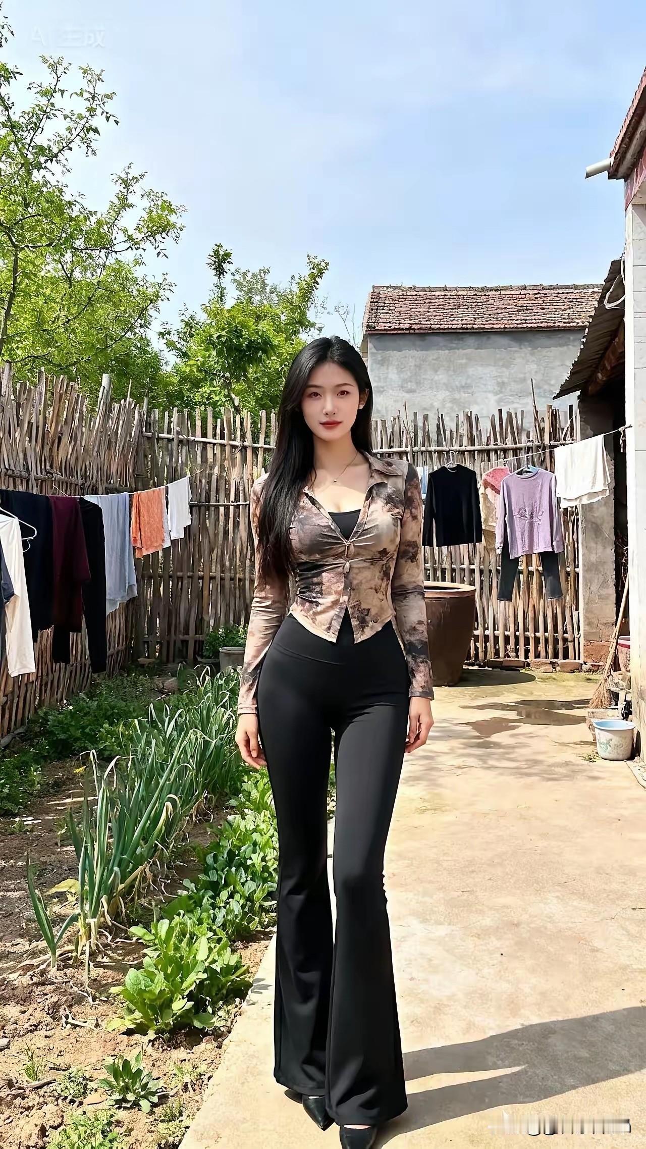 农家美女真是靓, 气质优雅显时尚, 肤白貌美大长腿, 不输城里金凤凰。 农村女
