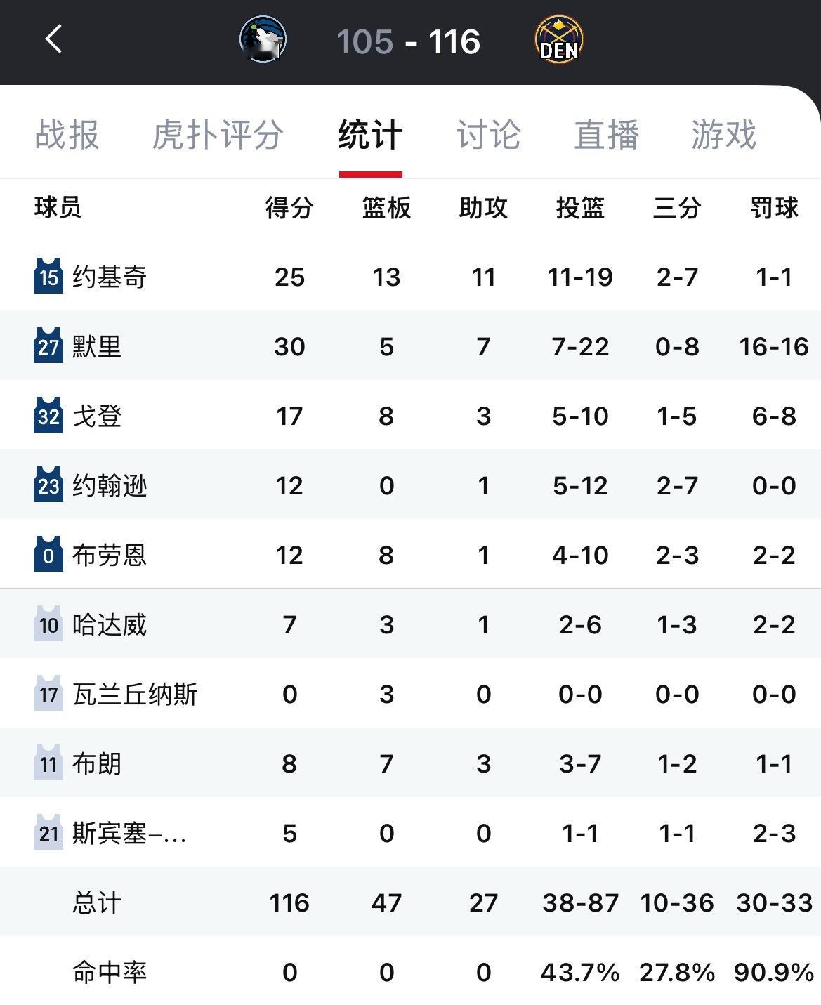 掘金116-105战胜森林狼,大比分1-0!穆雷30分,约基奇25分13板11助