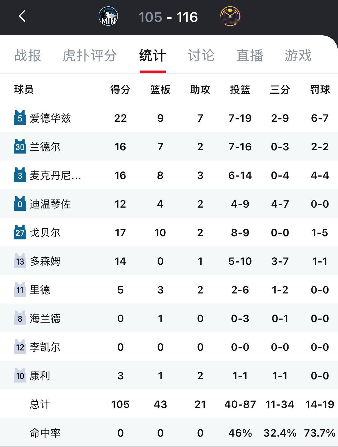 穆雷30分,约基奇25分13板11助;爱德华兹22分9板7助森林狼vs掘金