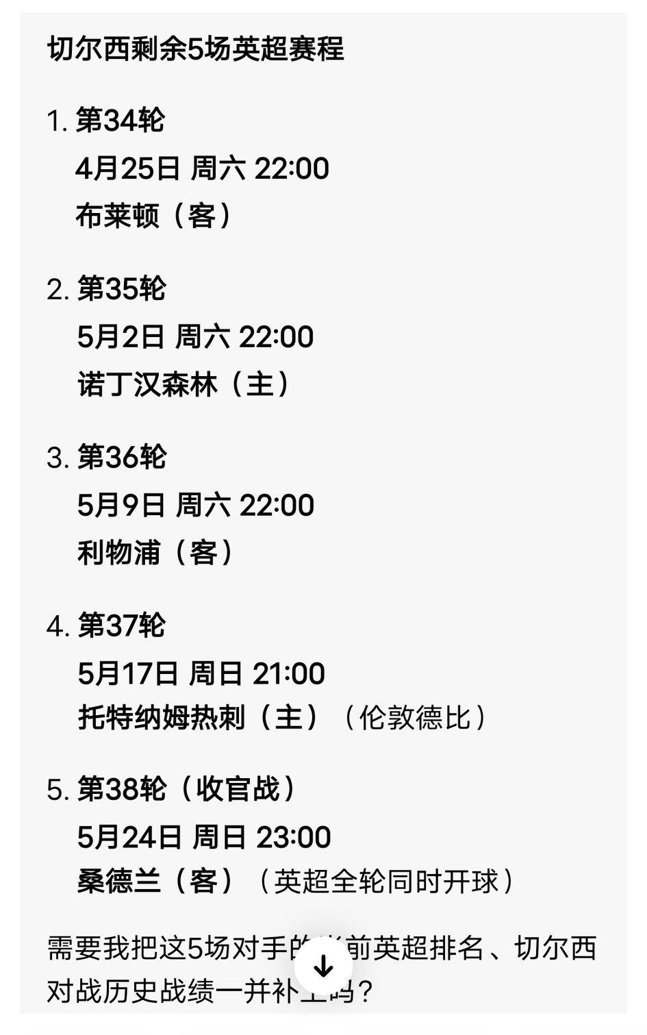 可再看看它剩下的五场比赛所面对的五个对手,大家觉得哪一个是善茬?布莱顿,在争欧战席位;诺丁汉森林,在保级;利物浦,欧冠席位最主要的竞争对手;热刺,也在保级;即便最后一轮的桑德兰,也有可能在争夺欧战席位。