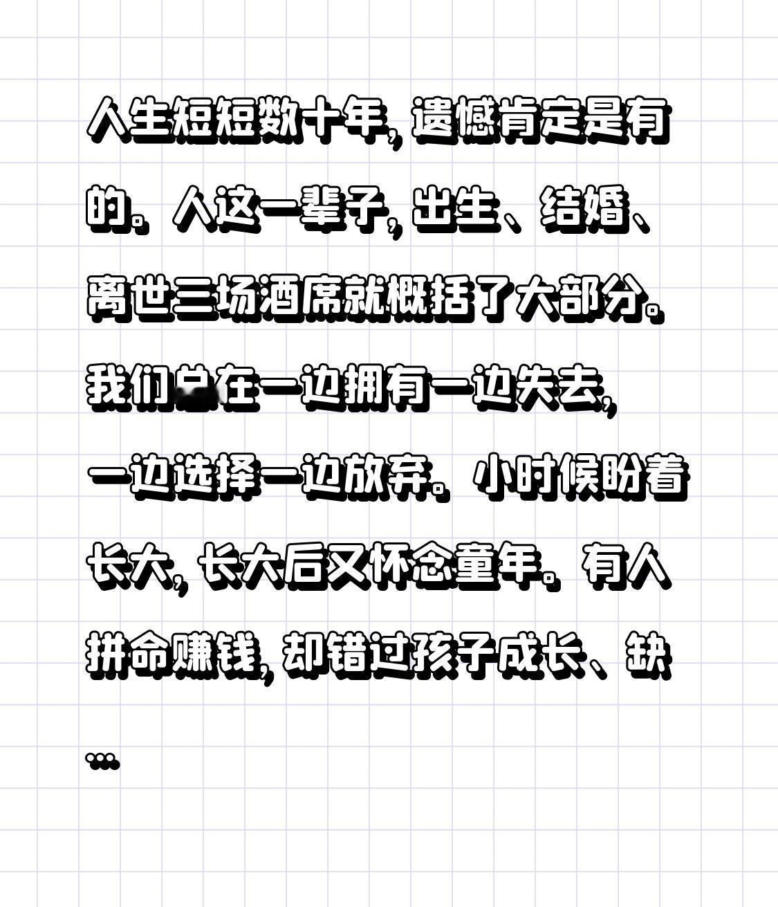 人生短短数十年,遗憾肯定是有的。人这一辈子,出生、结婚、离世三场酒席就概括了大部分。我们总在一边拥有一边失去,一边选择一边放弃。小时候盼着长大,长大后又怀念童年。