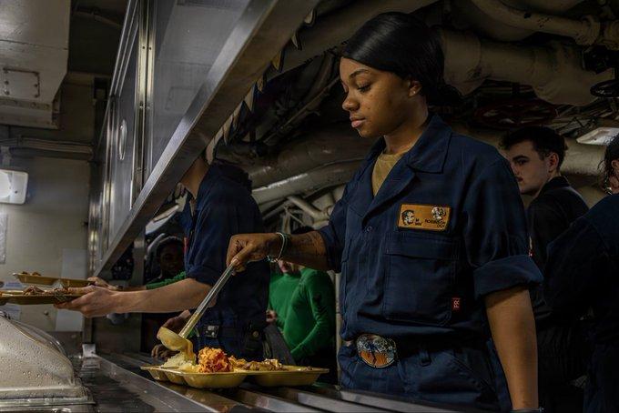 美国海军发布图片,宣布:海军食堂全程服务""林肯号与"的黎波里"号上的水兵们持续享用按时供应的膳食-﹣供应不中断,物资无短缺"