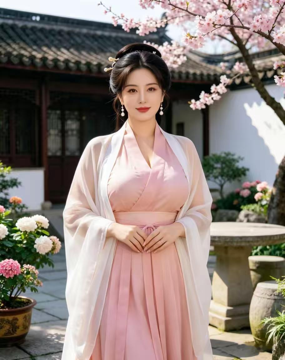 樱花树下,少女与古塔相映成趣,春日美景尽收眼底。