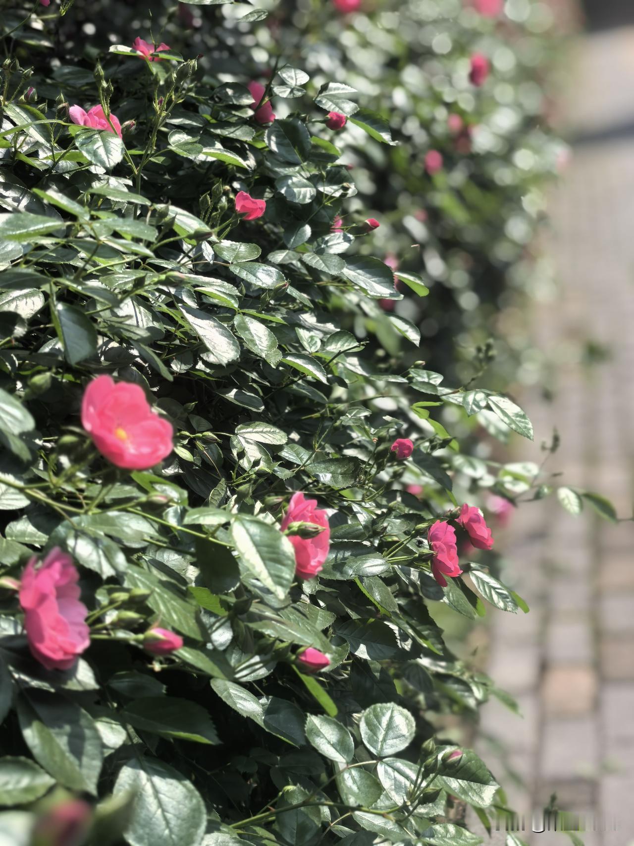 蔷薇爬在围网上,形成花墙,再垂吊下来,远处望是星星点点的红色粉色或白色,很浓密。近看一朵一朵娇羞着。