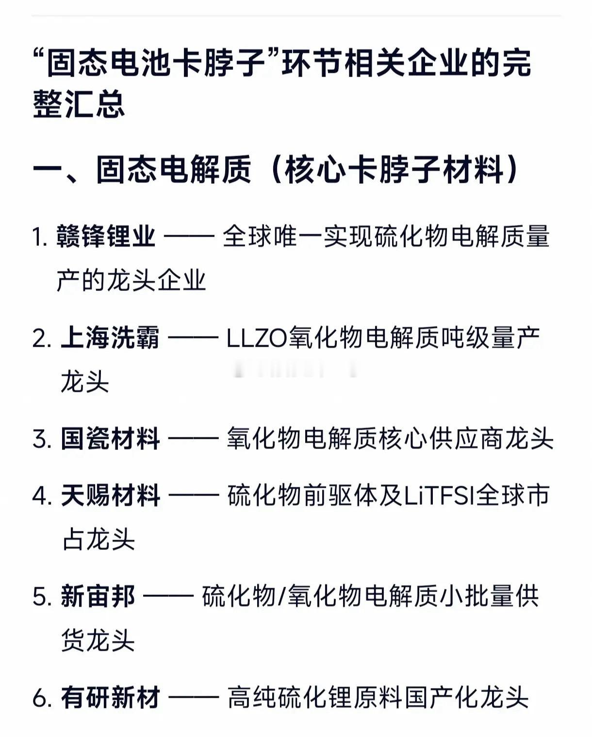 “固态电池卡脖子”环节相关企业的完整汇总一、固态电解质(核心卡脖子材料)赣锋锂业